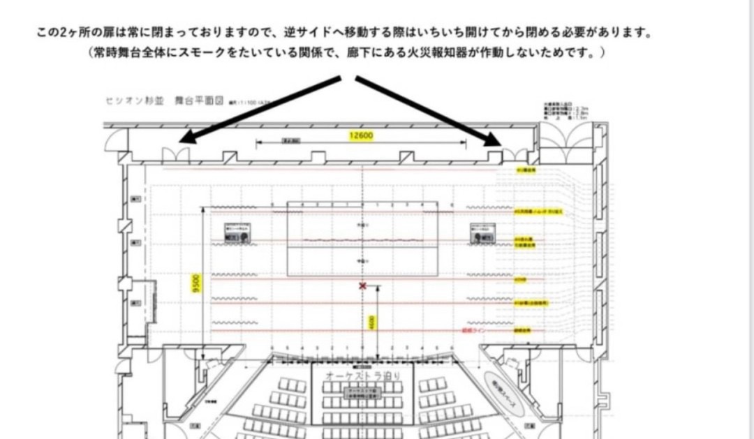 - 袖内に1ヶ所ずつある扉は常に閉まっています。逆サイドへ移動する際は、都度開けてから閉める必要があります(常時舞台全体にスモークをたいている関係で、廊下にある火災報知器が作動しないためです)。