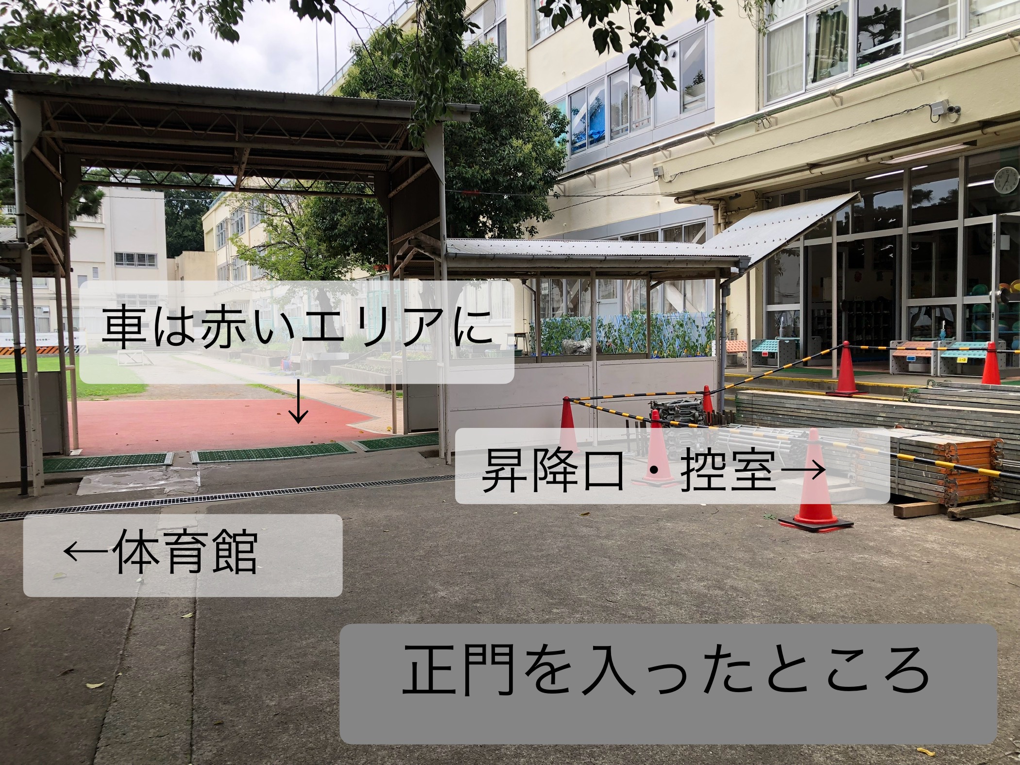 車は、渡り廊下の向こうの赤い舗装部分に停めてください。